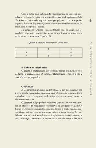 A Conclusão, a exemplo da Introdução e das Referências, não é uma secção numerada e apresenta uma síntese que resume e torna mais claro o corpo e argumento do artigo, apresentando os pontos de vista com concisão. O presente artigo poderá contribuir para estabelecer uma norma de redação de comunicações aplicável às publicações :Estúdio, Gama e Croma, promovendo ao mesmo tempo o conhecimento produzido por artistas e comunicado por outros artistas: trata-se de estabelecer patamares eficazes de comunicação entre criadores dentro de uma orientação descentrada e atenta aos novos discursos sobre arte.