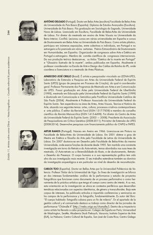 ANTÓNIO DELGADO (Portugal). Doutor em Belas Artes (escultura) Faculdade de Belas Artes da Universidade do Pais Basco (Espanha). Diploma de Estudos Avançados (Escultura). Universidade do País Basco. Pós graduação em Sociologia do Sagrado, Universidade Nova de Lisboa. Licenciado em Escultura, Faculdade de Belas-Artes da Universidade de Lisboa. Foi diretor do mestrado em ensino de Artes Visuais na Universidade da Beira Interior, Covilhã. Lecionou cursos em várias universidades em Espanha e cursos de Doutoramento em Belas Artes na Universidade do Pais Basco. Como artista plástico, participou em inúmeras exposições, entre colectivas e individuais, em Portugal e no estrangeiro e foi premiado em vários certames. Prémio Extraordinário de Doutoramento em Humanidades, em Espanha. Organizador de congressos sobre Arte e Estética em Portugal e estrangeiro. Membro de comités científicos de congressos internacionais. Da sua produção teórica destacam-se, os titulos “Estetica de la muerte em Portugal” e “Glossário ilustrado de la muerte”, ambos publicados em Espanha. Atualmente é professor coordenador na Escola de Arte e Design das Caldas da Rainha do IPL, onde coordena a licenciatura e o mestrado de Artes Plásticas. APARECIDO JOSÉ CIRILLO (Brasil). É artista e pesquisador vinculado ao LEENA-UFES, Laboratório de Extensão e Pesquisa em Artes da Universidade Federal de Espírito Santo (UFES) (grupo de pesquisa em Processo de Criação), do qual é coordenador geral. Professor Permanente dos Programas de Mestrado em Artes e em Comunicação da UFES. Possui graduação em Artes pela Universidade Federal de Uberlândia (1990), mestrado em Educação pela Universidade Federal do Espírito Santo (1999) e doutorado em Comunicação e Semiótica pela Pontifícia Universidade Católica de São Paulo (2004). Atualmente é Professor Associado da Universidade Federal do Espírito Santo. Tem experiência na área de Artes, Artes Visuais, Teorias e História da Arte, atuando nos seguintes temas: artes, cultura, processos criativos contemporâneos e arte pública. É editor da Revista Farol (ISSN 1517-7858) e membro do conselho científico da Revista Manuscrítica (ISSN 1415-4498). Foi diretor do Centro de Artes da Universidade Federal do Espírito Santo (2005 — 2008); Presidente da Associação de Pesquisadores em Crítica Genética (2008-2011); Pró-reitor de Extensão da UFES (2008-2014). Desenvolve pesquisas com financiamento público do CNPQ e FAPES. ARTUR RAMOS (Portugal). Nasceu em Aveiro em 1966. Licenciou-se em Pintura na Faculdade de Belas-Artes da Universidade de Lisboa. Em 2001 obteve o grau de Mestre em Estética e filosofia da Arte pela Faculdade de Letras da Universidade de Lisboa. Em 2007 doutorou-se em Desenho pela Faculdade de Belas-Artes da mesma Universidade, onde exerce funções de docente desde 1995. Tem mantido uma constante investigação em torno do Retrato e do Auto-retrato, temas abordados nas suas teses de mestrado, O Auto-retrato ou a Reversibilidade do Rosto, e de doutoramento, Retrato: o Desenho da Presença. O corpo humano e a sua representação gráfica tem sido alvo da sua investigação mais recente. O seu trabalho estende-se também ao domínio da investigação arqueológica e em particular ao nível do desenho de reconstituição. CARLOS TEJO (Espanha). Doctor en Bellas Artes por la Universidad Politécnica de Valencia. Profesor Titular de la Universidad de Vigo. Su línea de investigación se bifurca en dos intereses fundamentales: análisis de la performance y estudio de proyectos fotográficos que funcionen como documento de un proceso performativo o como herramienta de la práctica artística que tenga el cuerpo como centro de interés. A su vez, esta orientación en la investigación se ubica en contextos periféricos que desarrollan temáticas relacionadas con aspectos identitarios, de género y transculturales. Bajo este corpus de intereses, ha publicado artículos e impartido conferencias y seminarios en los campos de la performance y la fotografía, fundamentalmente. Es autor del libro: “El cuerpo habitado: fotografía cubana para un fin de milenio”. En el apartado de la gestión cultural y el comisariado destaca su trabajo como director de las jornadas de performance “Chámalle X” (http://webs.uvigo.es/chamalle/). Dentro de su trayectoria como artista ha llevado a cabo proyectos en: Colegio de España en París; Universidad de Washington, Seattle; Akademia Stuck Pieknych, Varsovia; Instituto Superior de Arte (ISA), La Habana; Centro Cultural de España, San José de Costa Rica; Centro Galego