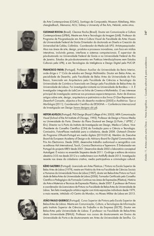 FRANCISCO PAIVA (Portugal). Professor Auxiliar da Universidade da Beira Interior, onde dirige o 1º Ciclo de estudos em Design Multimédia. Doutor em Belas Artes, especialidade de Desenho, pela Faculdade de Belas Artes da Universidade do País Basco, licenciado em Arquitectura pela Faculdade de Ciências e Tecnologia da Universidade de Coimbra e licenciado em Design pela Faculdade de Belas-Artes da Universidade de Lisboa. Foi investigador-visitante na Universidade de Bordéus — 3. É Investigador integrado do LabCom na linha de Cinema e Multimédia. O seu interesse principal de investigação centra-se nos processos espacio-temporais. Autor de diversos artigos sobre arte, design, arquitectura e património e dos livros O Que Representa o Desenho? Conceito, objectos e fins do desenho moderno (2005) e Auditórios: Tipo e Morfologia (2011). Coordenador Científico da DESIGNA — Conferência Internacional de Investigação em Design (www.designa.ubi.pt). HEITOR ALVELOS (Portugal). PhD Design (Royal College of Art, 2003). MFA Comunicação Visual (School of the Art Institute of Chicago, 1992). Professor de Design e Novos Media na Universidade do Porto. Director do Plano Doutoral em Design (U.Porto / UPTEC / ID+). Director na U.Porto do Instituto de Investigação em Design, Media e Cultura. Vice-Presidente do Conselho Científico (CSH) da Fundação para a Ciência e Tecnologia. Comissário, FuturePlaces medialab para a cidadania, desde 2008. Outreach Director do Programa UTAustin-Portugal em media digitais (2010-2014). Membro do Executive Board da European Academy of Design e do Advisory Board for Digital Communities do Prix Ars Electronica. Desde 2000, desenvolve trabalho audiovisual e cenográfico com as editoras Ash International, Touch, Cronica Electronica e Tapeworm. É Embaixador em Portugal do projecto KREV desde 2001. Desenvolve desde 2002 o laboratório conceptual Autodigest. É músico no ensemble Stopestra desde 2011. Co-dirige a editora de música aleatória 3-33.me desde 2012 e o weltschmerz icon Antifluffy desde 2013. Investigação recente nas áreas da cidadania criativa, media participativos e criminologia cultural. ILÍDIO SALTEIRO (Portugal). Licenciado em Artes Plásticas / Pintura na Escola Superior de Belas Artes de Lisboa (1979), mestre em História da Arte na Faculdade de Ciências Sociais e Humanas da Universidade Nova de Lisboa (1987), doutor em Belas-Artes Pintura na Faculdade de Belas-Artes da Universidade de Lisboa (2006). Formador Certificado pelo Conselho Cientifico e Pedagógico da Formação Continua nas áreas de Expressões (Plástica), História da Arte e Materiais e Técnicas de Expressão Plástica, desde 2007. É professor de Pintura e coordenador da Licenciatura de Pintura na Faculdade de Belas-Artes da Universidade de Lisboa. Tem feito investigação artística regular com trinta exposições individuais desde 1979, a mais recente, intitulado «O Centro do Mundo», no Museu Militar de Lisboa em 2013. JOÃO PAULO QUEIROZ (Portugal). Curso Superior de Pintura pela Escola Superior de Belas-Artes de Lisboa. Mestre em Comunicação, Cultura, e Tecnologias de Informação pelo Instituto Superior de Ciências do Trabalho e da Empresa (ISCTE). Doutor em Belas-Artes pela Universidade de Lisboa. É professor na Faculdade de Belas-Artes desta Universidade (FBAUL). Professor nos cursos de doutoramento em Ensino da Universidade do Porto e de doutoramento em Artes da Universidade de Sevilha. Co