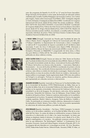 autor dos programas de Desenho A e B (10º ao 12º anos) do Ensino Secundário. Dirigiu formação de formadores e outras ações de formação em educação artística creditadas pelo Conselho Científico-Pedagógico da Formação Contínua. Livro Cativar pela imagem, 5 textos sobre Comunicação Visual FBAUL, 2002. Investigador integrado no Centro de Estudos e Investigação em Belas-Artes (CIEBA). Coordenador do Congresso Internacional CSO (anual, desde 2010) e diretor das revistas académicas :Estúdio, ISSN 1647-6158, Gama ISSN 2182-8539, e Croma ISSN 2182-8547. Coordenador do Congresso Matéria-Prima, Práticas das Artes Visuais no Ensino Básico e Secundário (anual, desde 2012). Dirige a Revista Matéria-Prima, ISSN 2182-9756. Membro de diversas comissões e painéis científicos, de avaliação, e conselhos editoriais. Diversas exposições individuais de pintura. Prémio de Pintura Gustavo Cordeiro Ramos pela Academia Nacional de Belas-Artes em 2004. J. PAULO SERRA (Portugal). Licenciado em Filosofia pela Faculdade de Letras de Lisboa e Mestre, Doutor e Agregado em Ciências da Comunicação pela UBI, onde é Professor Catedrático no Departamento de Comunicação e Artes e investigador no LabCom.IFP. É vice-presidente da Sopcom e presidente do GT de Retórica desta associação. É autor dos livros A Informação como Utopia (1998), Informação e Sentido (2003) e Manual de Teoria da Comunicação (2008) e co-autor do livro Informação e Persuasão na Web(2009). É coorganizador de várias obras, a última das quais Retórica e Política (2014). Tem ainda vários capítulos de livros e artigos publicados em obras coletivas e revistas. JOÃO CASTRO SILVA (Portugal). Nasceu em Lisboa em 1966. Doutor em Escultura pela Faculdade de Belas-Artes da Universidade de Lisboa (FBAUL). Mestre em História da Arte pela Universidade Lusíada de Lisboa. Licenciado em Escultura pela FBAUL. É Professor de Escultura nos diversos ciclos de estudos — Licenciatura, Mestrado e Doutoramento — do curso de Escultura da FBAUL e coordenador do primeiro ciclo de estudos desta área. Tem coordenado diversas exposições de escultura e residências artísticas, estas últimas no âmbito da intervenção na paisagem. Desenvolve investigação plástica na área da escultura de talhe directo em madeira, intervenções no espaço público e na paisagem. Expõe regularmente desde 1990 e tem obra pública em Portugal e no estrangeiro. Participa em simpósios, ganhou diversos prémios e está representado em colecções nacionais e internacionais. JOAQUÍN ESCUDER (Espanha). Licenciado en Pintura por la Facultad de Bellas Artes de la Universidad de Barcelona (1979/1984).Doctorado en Bellas Artes por la Facultad de Bellas Artes de la Universidad Politécnica de Valencia (2001). Ha sido profesor en las siguientes universidades: Internacional de Catalunya y Murcia; en la actualidad lo es de la de Zaragoza. Ha sido becario, entre otras, de las siguientes instituciones: Generalitat de Catalunya, Casa de Velázquez, Grupo Endesa y Real Academia de España en Roma. Trabaja en cuestiones relacionadas con la visualidad y la representación en la pintura. Ha expuesto individualmente en Francia y las siguientes ciudades españolas: Madrid, Valencia, Zaragoza, Palma de Mallorca, Castellón y Cádiz. Ha participado en numerosas muestras colectivas, destacando en el exterior las realizadas en Utrecht, Venecia, París y Tokio. Su obra se encuentra representada en colecciones de instituciones públicas y privadas de España. JOSU REKALDE (Espanha, Amorebieta — País Vasco, 1959) Compagina la creación artística con la de profesor catedrático en la Facultad de Bellas Artes de La universidad del País Vasco. Su campo de trabajo es multidisciplinar aunque su faceta más conocida es la relacionada con el video y las nuevas tecnologías. Los temas que trabaja se desplazan desde el intimismo a la relación social, desde el Yo al Otro, desde lo metalingüístico a lo narrativo. Ha publicado numerosos artículos y libros entre los que destacamos: The Technological “Interface” in Contemporary Art en Innovation: Economic, Social and Cultural Aspects. University of Nevada, (2011). En los márgenes del arte cibernético en Lo tecnológico en el arte.. Ed. Virus. Barcelona. (1997). Bideo-Artea Euskal Herrian. Editorial Kriselu. Donostia.(1988). El vídeo, un