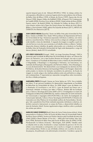 JUAN CARLOS MEANA (Espanha). Doctor em Bellas Artes pela Universidad do País Basco. Estudos na ENSBA, Paris. Desde 1993 é professor do Departamento de Pintura da Universidade de Vigo. Numerosas exposições individuais e coletivas, com vários premios e reconhecimentos. Publicou vários escritos e artigos em catálogos e revistas onde trabalha o tema da identidade. A negação da imagem no espelho a partir do mito de Narciso é uma das suas constantes no el trabalho artístico e reflexivo. Também desenvolve diversos trabalhos de gestão relacionados con a docência na Facultad de Bellas Artes de Pontevedra (Universidad de Vigo) onde desempenha o cargo de decano (diretor), desde 2010 à actualidade. LUÍS JORGE GONÇALVES (Portugal, 1962). Luís Jorge Gonçalves (Portugal, 1962) é doutorado pela Faculdade de Belas-Artes da Universidade de Lisboa, em Ciências da Arte e do Património, com a tese Escultura Romana em Portugal: uma arte no quotidiano. A docência na Faculdade de Belas-Artes é entre a História da Arte (Pré-História e Antiguidade), a Museologia e a Arqueologia e Património, nas licenciaturas, nos mestrados de Museologia e Museografia e de Património Público, Arte e Museologia e no curso de doutoramento. Tem desenvolvido a sua investigação nos domínios da Arte Pré-Histórica, da Escultura Romana e da Arqueologia Pública e da Paisagem. Desenvolve ainda projetos no domínio da ilustração reconstitutiva do património, da função da imagem no mundo antigo e dos interfaces plásticos entre arte pré-histórica e antiga e arte contemporânea. É responsável por exposições monográficas sobre monumentos de vilas e cidades portuguesas. MARGARIDA PRIETO (Portugal). Nasceu em Torres Vedras em 1976. Vive e trabalha em Lisboa. O seu percurso académico foi desenvolvido integralmente na Faculdade de Belas-Artes da Universidade de Lisboa. Em 2008 obteve o grau de Mestre com a dissertação «O Livro-Pintura» e, em 2013, o grau de Doutora em Pintura com a dissertação intitulada «A Pintura que retém a Palavra». Bolseira I&D da Fundação para a Ciência e Tecnologia (FCT) entre 2008 e 2012. É Investigadora no Centro de Investigação em Belas-Artes (CIEBA-FBA/UL), membro colaborador do Centro de Estudos em Comunicação e Linguagens (CECL-FCSH/UNL) e do Centro de Investigação em Comunicação Aplicada, Cultura e Novas Tecnologias (CICANT-ULHT). É Directora da Licenciatura em Artes Plásticas da Universidade Lusófona de Humanidades e Tecnologias. Sob o pseudónimo Ema M tem realizado exposições individuais e colectivas, em território nacional e internacional, no campo da Pintura, e desenvolvido trabalhos na área da ilustração infantil. Escreve regularmente artigos científicos sobre a produção dos artistas que admira. MARIA DO CARMO VENEROSO (Brasil). Maria do Carmo Freitas (nome artístico). Artista pesquisadora e Professora Titular da Escola de Belas Artes da Universidade Federal de Minas Gerais (UFMG). Doutora em Estudos Literários pela Faculdade de Letras da UFMG (2000) e Mestre (Master of Fine Arts — MFA) pelo Pratt Institute, New York, EUA (1984). Bacharel em Belas Artes pela Escola de Belas Artes da UFMG (1978). Pós-doutorado na Indiana University – Bloomington, EUA (2009). Trabalha sobre as relações entre as artes, focalizando o campo ampliado da gravura e do livro de artista e suas interseções e contrapontos com a escrita e a imagem no contexto da arte contemporânea. Divide as suas atividades artísticas com a prática do ensino, da pesquisa, da publicação e da administração universitária. Coordena o grupo de