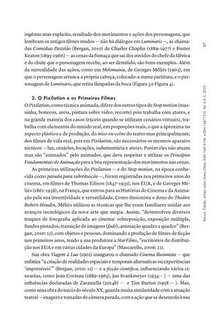 2. O Pixilation e os Primeiros Filmes O Pixilation, como técnica animada, difere dos outros tipos de Stop motion (massinha, bonecos, areia, pintura sobre vidro, recorte) pois trabalha com atores, e na grande maioria dos casos (exceto quando se utilizam cenários virtuais), trabalha com elementos do mundo real, em proporções reais, o que a aproxima no aspecto plástico e de produção, do mise-en-scène do teatro mas principalmente, dos filmes de vida real, pois em Pixilation, são necessários os mesmos aparatos técnicos — luz, cenários, locações, indumentária e atores. Porém eles não atuam mas são “animados” pelo animador, que deve respeitar e utilizar os Princípios Fundamentais de Animação para a boa representação dos movimentos nas cenas. As primeiras utilizações do Pixilation — e do Stop motion, na época conhecida como parada para substituição —, foram registradas nos primeiros anos do cinema, em filmes de Thomas Edison (1847-1931), nos EUA, e de Georges Méliès (1861-1938), na França, que entrou para as Histórias do Cinema e da Animação pela sua inventividade e versatilidade. Como ilusionista e dono do Theâtre Robert-Houdin, Méliès utilizou as técnicas que lhe eram familiares unidas aos avanços tecnológicos da nova arte que surgia. Assim, “desenvolveu diversos truques de fotografia aplicada ao cinema: sobreposição, exposição múltipla, fundos pintados, transição de imagens (fade), animação quadro a quadro” (Bergan, 2010: 12), com objetos e pessoas, dominando a produção de filmes de ficção nos primeiros anos, tendo a sua produtora a StarFilms, “escritórios de distribuição nos EUA e em várias cidades da Europa” (Mascarello, 2006: 21). Sua obra Viagem à Lua (1902) inaugurou o chamado Cinema Ilusionista — que enfatiza “a criação de realidades espaciais e temporais alternativas ou experiências ‘impossíveis’” (Bergan, 2010: 12) — e a ficção científica, influenciando vários cineastas, como Jean Cocteau (1889-1963), Jan Svankmeyer (1934— ) — uma das influências declaradas de Zaramella (2014b) — e Tim Burton (1958 — ). Mas, como uma obra do início do século XX, guarda muita similaridade com a atuação teatral — exagero e tomadas de câmera parada, com a ação que se desenrola à sua