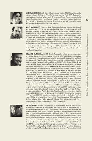 NUNO SACRAMENTO (Portugal). Nuno Sacramento (Portugal). Nasceu em Maputo, Moçambique em 1973, e vive em Aberdeenshire, Escócia, onde dirige o Scottish Sculpture Workshop. É licenciado em Escultura pela Faculdade de Belas Artes — Universidade de Lisboa, graduado do prestigiado Curatorial Training Programme da DeAppel Foundation (bolseiro Gulbenkian), e Doutorado em curadoria pela School of Media Arts and Imaging, Dundee University com a tese Shadow Curating: A Critical Portfolio. Depois de uma década a desenvolver exposições e plataformas de projeto internacionais, torna-se investigador associado (Honorary Research Fellow) do Departamento de Antropologia, Universidade de Aberdeen e da FBA-UL onde pertence à comissão científica do congresso CSO e da revista :Estúdio. É co-autor do livro ARTocracy. Art, Informal Space, and Social Consequence: A Curatorial book in collaborative practice. ORLANDO FRANCO MANESCHY (Brasil). Pesquisador, artista, curador independente e crítico. Doutor em Comunicação e Semiótica pela PUC-SP.Desenvolve estágio pós-doutoral na Faculdade de Belas Artes da Universidade de Lisboa. É professor na Universidade Federal do Pará, atuando na graduação e pós-graduação. Coordenador do grupo de pesquisas Bordas Diluídas (UFPA/CNPq). É articulação do Mirante – Território Móvel, uma plataforma de ação ativa que viabiliza proposições de arte. Como artista tem participado de exposições e projetos no Brasil e no exterior, como: Triangulações,Pinacoteca UFAL — Maceió, CCBEU — Belém e MAM — Bahia, de set. a nov. 2014; Pororoca: A Amazônia no MAR, Museu de Arte do RIo de Janeiro, 2014; Rotas: desvios e outros ciclos, CDMAC, Fortaleza, 2012 ; Entre o Verde Desconforto do Úmido, CCSP, São Paulo, 2012; Superperformance, São Paulo, 2012 ; Arte Pará 2011, Belém, 2011;Wild Nature, Alemanha, 2009; Equatorial, Cidade do México, 2009; entre outros. Recebeu, entre outros prêmios, a Bolsa Funarte de Estímulo à Produção Crítica em Artes (Programa de Bolsas 2008); o Prêmio de Artes Plásticas Marcantonio Vilaça / Prêmio Procultura de Estímulo às Artes Visuais 2010 da Funarte e o Prêmio Conexões Artes Visuais – MINC | Funarte | Petrobras 2012, com os quais estruturou a Coleção Amazoniana de Arte da UFPA, realizando mostras, seminários, site e publicação no Projeto Amazônia, Lugar da Experiência. Realizou, as seguintes curadorias: Projeto Correspondência (plataforma de circulação via arte-postal), 2003-2008; Entorno de Operações Mentais, 2006; Contigüidades – dos anos 1970 aos anos 2000 (40 anos de história da arte em Belém), 2008; Projeto Arte Pará 2008, 2009 e 2010; Amazônia, a arte, 2010; Contra-Pensamento Selvagem (dentro de Caos e Efeito), (com Paulo Herkenhoff, Clarissa Diniz e Cayo Honorato), 2011; ProjetoAmazônia, Lugar da Experiência, 2012, entre outras. PEP MONTOYA (Espanha). Estudios en la Facultad de Bellas Artes de la universidad de Barcelona, Licenciado en Bellas Artes (1990-1995) Doctor en Bellas Artes por la Universidad de Barcelona (2002), Licenciado en Artes Escénicas por el Instituto del Teatro Barcelona 1986- 1990. Secretario Académico del Departamento de Pintura 2004 — 2008. Vicedecano de cultura i Estudiantes 2008 — 2012. Desde diciembre 2012 forma parte del Patronato de la Fundación Felicia Fuster de Barcelona Actualmente, profesor y coordinador Practicums Master Producció Artística i Recerca ProDart (línea: Art i Contextos Intermedia) Obras en: Colecció Testimoni La Caixa (Barcelona), Colección Ayuntamiento de Barcelona, Colección L’Oreal de Pintura (Madrid), Colección BBV Barcelona, Coleción Todisa grupo Bertelsmann, Coleción Patrimoni de la Universidad de Barcelona, Beca de la Fundación Amigò Cuyás. Barcelona. Coleciones privadas en españa (Madrid, Barcelona), Inglaterra (Londres) y Alemania (Manheim).