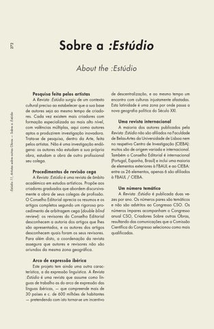 Uma revista internacional A maioria dos autores publicados pela Revista :Estúdio não são afiliados na Faculdade de Belas-Artes da Universidade de Lisboa nem no respetivo Centro de Investigação (CIEBA): muitos são de origem variada e internacional. Também o Conselho Editorial é internacional (Portugal, Espanha, Brasil) e inclui uma maioria de elementos exteriores à FBAUL e ao CIEBA: entre os 26 elementos, apenas 6 são afiliados à FBAUL / CIEBA.