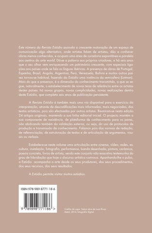 Este número da Revista Estúdio assinala a crescente maturação de um espaço de comunicação algo alternativo, onde artistas falam de artistas, dão a conhecer obras menos conhecidas, e ocupam uma área de curadoria expontânea e paralela aos centros do arte world. Dá-se a palavra aos próprios criadores, e há seis anos que o seu olhar vem enriquecendo um património crescente, com especiais ligações aos países onde se fala as línguas ibéricas. A presença de obras de Portugal, Espanha, Brasil, Angola, Argentina, Perú, Venezuela, Bolívia e muitos outros países tornou-se habitual, fazendo da Estúdio uma instância da semiosfera (Lotman). Mais do que a presença, é a dimensão do conhecimento transmitido, a que se segue, naturalmente, o estabelecimento de novas teias de referência entre os artistas destes países: há novos grupos, novas cumplicidades, novas realizações dentro deste Estúdio, que completa seis anos de publicação persistente. A Revista Estúdio é também mais uma via disponível para o exercício da interpretação, através de descodificações mais informadas, mais negociadas, dos textos artísticos, pois são efectuadas por outros artistas. Reuniram-se nesta edição 24 artigos originais, mantendo a sua linha editorial inicial. O projecto mantém a sua componente de resistência, de plataforma de conhecimento para os pares, não abdicando também da validação externa, ou seja, do uso de protocolos de produção e transmissão de conhecimento. Falamos pois das normas de redação, de referenciação, de estruturação de textos e de articulação de argumentos, visuais ou verbais. Estabelece-se neste volume uma articulação entre cinema, vídeo, redes, escultura, instalação, fotografia, performance, banda desenhada, pintura, cerâmica, poesia concreta, livros de artista, sendo este conjunto não exaustivo testemunha do grau de hibridação que hoje o discurso artístico convoca. Apanhando-lhe o pulso, a Estúdio acompanha a arte desde os seus produtores, dos seus procedimentos, dos seus recursos, dos seus resultados. A Estúdio permite visitar muitos estúdios.