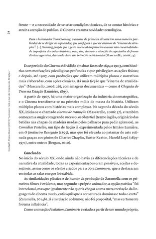 Esse período do Cinema é dividido em duas fases: de 1894 a 1903, com histórias sem motivações psicológicas profundas e que privilegiam as ações físicas; e depois, até 1907, com produções que utilizam múltiplos planos e narrativas mais elaboradas, com ações cômicas. Há mais ficção que “cinema de atualidades” (Mascarello, 2006: 26), com imagens documentais — como A Chegada do Trem na Estação (Lumiére, 1895). A partir de 1907, há uma maior organização da indústria cinematográfica, e o Cinema transforma-se na primeira mídia de massa da história. Utilizam múltiplos planos com histórias mais complexas. Na segunda década do século XX, inicia-se o chamado cinema de transição (Mascarello, 2006: 37), e também começam a surgir com grande sucesso, os Slapstick (termo inglês, originário das batidas nas chapas de madeira usadas pelos palhaços para pedir aplausos), as Comédias Pastelão, um tipo de ficção já experimentada pelos Irmãos Lumière, em O Jardineiro Renegado (1895), mas que foi elevada ao patamar de arte refinada graças aos gênios de Charles Chaplin, Buster Keaton, Harold Loyd (18931971), entre outros (Bergan, 2010). Conclusão No início do século XX, onde ainda não havia as diferenciações técnicas e de narrativa da atualidade, todas as experimentações eram possíveis, aceitas e desejáveis, assim como os efeitos criados para a obra Luminaris, que a destacaram em todas as salas em que foi exibida. As similaridades plástica e de humor da produção de Zaramella com os primeiros filmes é evidente, mas segundo o próprio animador, a opção estética “foi intencional, mas que igualmente não queria chegar a uma mera recriação da linguagem do cinema mudo, então quis que a cor saturada dominasse todo o curta” (Zaramella, 2014b). Já em relação ao humor, não foi proposital, “mas certamente foi uma influência”. Como animação Pixilation, Luminaris é criado a partir de um mundo próprio,