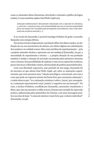 E na versão de Zaramella, é possível mastigar bolinhas de gude e ascender lâmpadas sem energia elétrica. Em termos técnicos logicamente a produção difere dos filmes mudos, na utilização da cor, nos movimentos de câmera, nos efeitos digitais nas substituições dos cenários e no cuidado sonoro. Mas como um filme de experimentação — pois o próprio animador declara e apresenta em seu making of (Zaramella, 2014a), a necessidade de experimentar a técnica —, a própria situação de sua produção também é similar a situação de inovação encontrada pelos primeiros cineastas com o Cinema. Essa possibilidade de explorar e criar novas expressões artísticas, parece favorecer a liberdade criativa, desvinculada de padrões preestabelecidos. Com essa liberdade expressiva, mas partindo de um tango, Zaramella foi de encontro ao que afirma Paul Wells (1998: 46) sobre as animações experimentais, que estas possuem uma “relação psicológica e emocional, com som e cores que pode ser expressa através da forma livre que caracteriza animação”, e ainda observa que: “se a animação ortodoxa é sobre a ‘prosa’, por conseguinte, a animação experimental é mais ‘poética’ e sugestiva em sua intenção”. No caso, a técnica Pixilation, escolhida por Zaramella, caracteriza visualmente o filme, que com sua narrativa e trilha sonora, formam um exemplo de expressão poética, influenciada pelos primórdios do Cinema, com uma mensagem positiva nos dias de hoje: “a soma de talentos é mais forte que o talento individual” (Zaramella, 2014b).