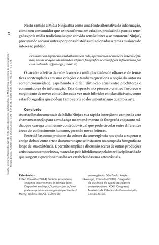 O caráter coletivo da rede favorece a multiplicidades de olhares e de temáticas contempladas em suas criações e também questiona a noção do autor na contemporaneidade, espelhando a difícil distinção atual entre produtores e consumidores de informação. Esta dispersão no processo criativo favorece o surgimento de novos conteúdos cada vez mais híbridos e inclassificáveis, como estas fotografias que podem tanto servir ao documentarismo quanto à arte. Conclusão As criações documentais da Mídia Ninja e sua rápida inserção no campo da arte chamam atenção para a mudança no entendimento da fotografia enquanto mídia, que carrega um mesmo conteúdo visual que pode circular entre diferentes áreas do conhecimento humano, gerando novas leituras. Entendê-las como produtos da cultura da convergência nos ajuda a superar o antigo debate entre arte e documento que se instaurou no campo da fotografia ao longo de sua existência. E permite ampliar a discussão acerca de outras produções artísticas contemporâneas, marcadas pelo hibridismo e pela interdisciplinaridade que surgem e questionam as bases estabelecidas nas artes visuais.