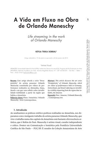 39 Sobral, Keyla Tikka (2015) “A Vida em Fluxo na Obra de Orlando Maneschy.” Revista :Estúdio, Artistas sobre Outras Obras. ISSN 1647-6158, e-ISSN 1647-7316. Vol. 6 (11): 39-47.