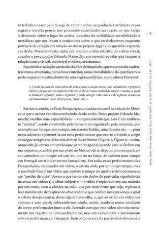 Partimos, então, da Série Desaparições, iniciada em 2008 na cidade do México, e que o artista vem desenvolvendo desde então. Neste projeto Orlando Maneschy escolhe uma espacialidade — compreendendo que esta é um ambiente “natural”, sendo construído pelo homem ou organizado pela natureza, por exemplo: um bosque, um campo, um terreno baldio, uma floresta etc. — , para nesta adentrar e penetrá-la em uma performance que ocorre até onde o corpo consegue atingir em linha reta dentro do ambiente (Figura 1, Figura 2). Assim, Maneschy já entrou em um bosque parando apenas quando este se fechou em um espinheiro; andou por um platô no México até se deparar com um penhasco; caminhou no bosque até cair em um rio na Suíça; atravessou num campo em Portugal até afundar em um lamaçal etc. Em todas essas performances das Desaparições, capturadas em vídeo, o artista anda por um longo tempo, mas o resultado final é um vídeo que contém o tempo no qual o artista permanece até “perder de vista”. Assim o que temos são dados de particular significância inscritas em vídeo: 1) o olhar subjetivo — o vídeo é registrado em sua maioria por um outro, com a câmera na mão, que por mais firme que seja, registra o leve movimento de respirar do observador, o que confere uma presença, a qual o artista deseja afirmar, desse alguém que olha, e, que ao exibir em vídeo nos captura a esse papel; colocando-nos ainda, assim, também numa condição de corpo-performador junto a ele, fazendo com que este vídeo não seja meramente um registro de uma performance, mas um campo para o pensamento sobre a performance e a imagem, bem como acerca da passividade dos papéis