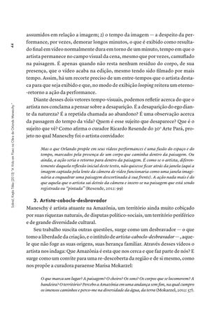 assumidos em relação a imagem; 2) o tempo da imagem — a despeito da performance, por vezes, demorar longos minutos, o que é exibido como resultado final em vídeo normalmente dura em torno de um minuto, tempo em que o artista permanece no campo visual da cena, mesmo que por vezes, camuflado na paisagem. É apenas quando não resta nenhum resíduo do corpo, de sua presença, que o vídeo acaba na edição, mesmo tendo sido filmado por mais tempo. Assim, há um recorte preciso de um entre-tempos que o artista destaca para que seja exibido e que, no modo de exibição looping reitera um eterno-retorno a ação da performance. Diante desses dois vetores tempo-visuais, podemos refletir acerca do que o artista nos conclama a pensar sobre a desaparição. É a desaparição do ego diante da natureza? É a repetida chamada ao abandono? É uma observação acerca da passagem do tempo da vida? Quem é esse sujeito que desaparece? Que é o sujeito que vê? Como afirma o curador Ricardo Resende do 30o Arte Pará, projeto no qual Maneschy foi o artista convidado: Mas o que Orlando propõe em seus vídeos performances é uma fusão do espaço e do tempo, marcados pela presença de um corpo que caminha dentro da paisagem. Ou ainda, a ação seria o retorno para dentro da paisagem. É como se o artista, diferentemente daquela reflexão inicial deste texto, não quisesse ficar atrás da janela (aqui a imagem captada pela lente da câmera de vídeo funcionaria como uma janela imaginária a enquadrar uma paisagem descortinada à sua frente). A ação nada mais é do que aquela que o artista sai detrás da câmera e insere-se na paisagem que está sendo registrada ou “pintada” (Resende, 2012: 99)