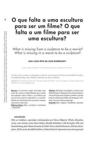 O que falta a uma escultura para ser um filme? O que falta a um filme para ser uma escultura? What is missing from a sculpture to be a movie? What is missing in a movie to be a sculpture? ANA LUISA RITO DA SILVA RODRIGUES* Artigo completo submetido a 13 de Janeiro e aprovado a 24 de janeiro de 2015.