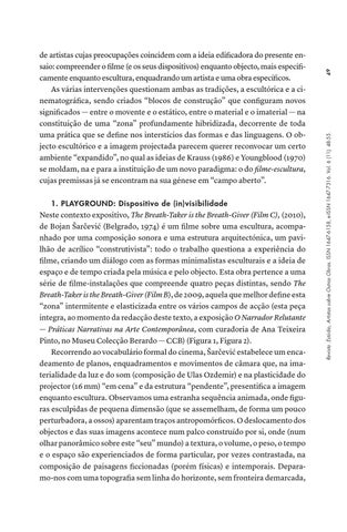 1. PLAYGROUND: Dispositivo de (in)visibilidade Neste contexto expositivo, The Breath-Taker is the Breath-Giver (Film C), (2010), de Bojan Šarčević (Belgrado, 1974) é um filme sobre uma escultura, acompanhado por uma composição sonora e uma estrutura arquitectónica, um pavilhão de acrílico “construtivista”: todo o trabalho questiona a experiência do filme, criando um diálogo com as formas minimalistas esculturais e a ideia de espaço e de tempo criada pela música e pelo objecto. Esta obra pertence a uma série de filme-instalações que compreende quatro peças distintas, sendo The Breath-Taker is the Breath-Giver (Film B), de 2009, aquela que melhor define esta “zona” intermitente e elasticizada entre os vários campos de acção (esta peça integra, ao momento da redacção deste texto, a exposição O Narrador Relutante — Práticas Narrativas na Arte Contemporânea, com curadoria de Ana Teixeira Pinto, no Museu Colecção Berardo — CCB) (Figura 1, Figura 2). Recorrendo ao vocabulário formal do cinema, Šarčević estabelece um encadeamento de planos, enquadramentos e movimentos de câmara que, na imaterialidade da luz e do som (composição de Ulas Ozdemir) e na plasticidade do projector (16 mm) “em cena” e da estrutura “pendente”, presentifica a imagem enquanto escultura. Observamos uma estranha sequência animada, onde figuras esculpidas de pequena dimensão (que se assemelham, de forma um pouco perturbadora, a ossos) aparentam traços antropomórficos. O deslocamento dos objectos e das suas imagens acontece num palco construído por si, onde (num olhar panorâmico sobre este “seu” mundo) a textura, o volume, o peso, o tempo e o espaço são experienciados de forma particular, por vezes contrastada, na composição de paisagens ficcionadas (porém físicas) e intemporais. Deparamo-nos com uma topografia sem linha do horizonte, sem fronteira demarcada,