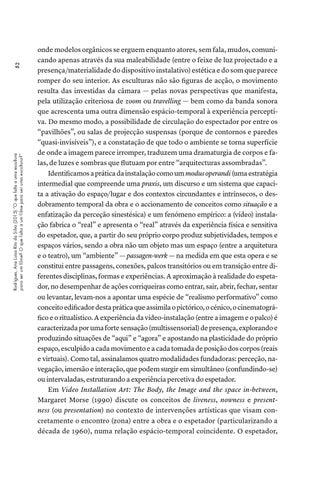 onde modelos orgânicos se erguem enquanto atores, sem fala, mudos, comunicando apenas através da sua maleabilidade (entre o feixe de luz projectado e a presença/materialidade do dispositivo instalativo) estética e do som que parece romper do seu interior. As esculturas não são figuras de acção, o movimento resulta das investidas da câmara — pelas novas perspectivas que manifesta, pela utilização criteriosa de zoom ou travelling — bem como da banda sonora que acrescenta uma outra dimensão espácio-temporal à experiência perceptiva. Do mesmo modo, a possibilidade de circulação do espectador por entre os “pavilhões”, ou salas de projecção suspensas (porque de contornos e paredes “quasi-invisíveis”), e a constatação de que todo o ambiente se torna superfície de onde a imagem parece irromper, traduzem uma dramaturgia de corpos e falas, de luzes e sombras que flutuam por entre “arquitecturas assombradas”. Identificamos a prática da instalação como um modus operandi (uma estratégia intermedial que compreende uma praxis, um discurso e um sistema que capacita a ativação do espaço/lugar e dos contextos circundantes e intrínsecos, o desdobramento temporal da obra e o accionamento de conceitos como situação e a enfatização da perceção sinestésica) e um fenómeno empírico: a (vídeo) instalação fabrica o “real” e apresenta o “real” através da experiência física e sensitiva do espetador, que, a partir do seu próprio corpo produz subjetividades, tempos e espaços vários, sendo a obra não um objeto mas um espaço (entre a arquitetura e o teatro), um “ambiente” — passagen-werk — na medida em que esta opera e se constitui entre passagens, conexões, palcos transitórios ou em transição entre diferentes disciplinas, formas e experiências. A aproximação à realidade do espetador, no desempenhar de ações corriqueiras como entrar, sair, abrir, fechar, sentar ou levantar, levam-nos a apontar uma espécie de “realismo performativo” como conceito edificador desta prática que assimila o pictórico, o cénico, o cinematográfico e o ritualístico. A experiência da vídeo-instalação (entre a imagem e o palco) é caracterizada por uma forte sensação (multissensorial) de presença, explorando e produzindo situações de “aqui” e “agora” e apostando na plasticidade do próprio espaço, esculpido a cada movimento e a cada tomada de posição dos corpos (reais e virtuais). Como tal, assinalamos quatro modalidades fundadoras: perceção, navegação, imersão e interação, que podem surgir em simultâneo (confundindo-se) ou intervaladas, estruturando a experiência percetiva do espetador. Em Video Installation Art: The Body, the Image and the space in-between, Margaret Morse (1990) discute os conceitos de liveness, nowness e presentness (ou presentation) no contexto de intervenções artísticas que visam concretamente o encontro (zona) entre a obra e o espetador (particularizando a década de 1960), numa relação espácio-temporal coincidente. O espetador,