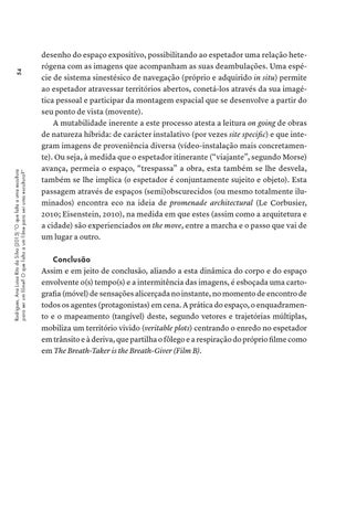 desenho do espaço expositivo, possibilitando ao espetador uma relação heterógena com as imagens que acompanham as suas deambulações. Uma espécie de sistema sinestésico de navegação (próprio e adquirido in situ) permite ao espetador atravessar territórios abertos, conetá-los através da sua imagética pessoal e participar da montagem espacial que se desenvolve a partir do seu ponto de vista (movente). A mutabilidade inerente a este processo atesta a leitura on going de obras de natureza híbrida: de carácter instalativo (por vezes site specific) e que integram imagens de proveniência diversa (vídeo-instalação mais concretamente). Ou seja, à medida que o espetador itinerante (“viajante”, segundo Morse) avança, permeia o espaço, “trespassa” a obra, esta também se lhe desvela, também se lhe implica (o espetador é conjuntamente sujeito e objeto). Esta passagem através de espaços (semi)obscurecidos (ou mesmo totalmente iluminados) encontra eco na ideia de promenade architectural (Le Corbusier, 2010; Eisenstein, 2010), na medida em que estes (assim como a arquitetura e a cidade) são experienciados on the move, entre a marcha e o passo que vai de um lugar a outro. Conclusão Assim e em jeito de conclusão, aliando a esta dinâmica do corpo e do espaço envolvente o(s) tempo(s) e a intermitência das imagens, é esboçada uma cartografia (móvel) de sensações alicerçada no instante, no momento de encontro de todos os agentes (protagonistas) em cena. A prática do espaço, o enquadramento e o mapeamento (tangível) deste, segundo vetores e trajetórias múltiplas, mobiliza um território vivido (veritable plots) centrando o enredo no espetador em trânsito e à deriva, que partilha o fôlego e a respiração do próprio filme como em The Breath-Taker is the Breath-Giver (Film B).
