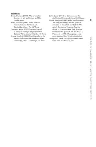 Referências Bruno, Giuliana (2002) Atlas of emotion: Journeys in art, architecture and film. London:Verso. Bruno, Giuliana (2007) Public Intimacy: Architecture and the Visual Arts. Cambridge, Mass.: The MIT Press. Eisenstein, Sergei (2010) Eisenstein Towards a Theory of Montage: Sergei Eisenstein Selected Works, Volume 2. London: I.B Tauris Krauss, Rosalind (1986) The Originality of the Avant-Garde and Other Modernist Myths. Cambridge, Mass.: Cambridge MIT Press.