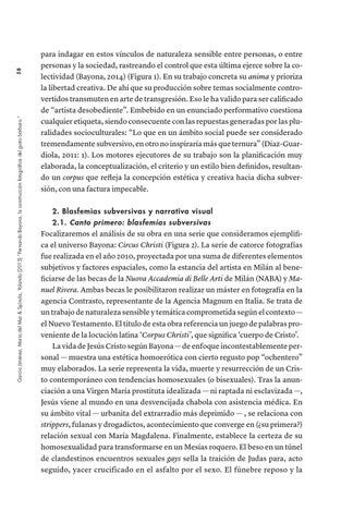 para indagar en estos vínculos de naturaleza sensible entre personas, o entre personas y la sociedad, rastreando el control que esta última ejerce sobre la colectividad (Bayona, 2014) (Figura 1). En su trabajo concreta su anima y prioriza la libertad creativa. De ahí que su producción sobre temas socialmente controvertidos transmuten en arte de transgresión. Eso le ha valido para ser calificado de “artista desobediente”. Embebido en un enunciado performativo cuestiona cualquier etiqueta, siendo consecuente con las repuestas generadas por las pluralidades socioculturales: “Lo que en un ámbito social puede ser considerado tremendamente subversivo, en otro no inspiraría más que ternura” (Díaz-Guardiola, 2011: 1). Los motores ejecutores de su trabajo son la planificación muy elaborada, la conceptualización, el criterio y un estilo bien definidos, resultando un corpus que refleja la concepción estética y creativa hacia dicha subversión, con una factura impecable. 2. Blasfemias subversivas y narrativa visual 2.1. Canto primero: blasfemias subversivas Focalizaremos el análisis de su obra en una serie que consideramos ejemplifica el universo Bayona: Circus Christi (Figura 2). La serie de catorce fotografías fue realizada en el año 2010, proyectada por una suma de diferentes elementos subjetivos y factores espaciales, como la estancia del artista en Milán al beneficiarse de las becas de la Nuova Accademia di Belle Arti de Milán (NABA) y Manuel Rivera. Ambas becas le posibilitaron realizar un máster en fotografía en la agencia Contrasto, representante de la Agencia Magnum en Italia. Se trata de un trabajo de naturaleza sensible y temática comprometida según el contexto — el Nuevo Testamento. El título de esta obra referencia un juego de palabras proveniente de la locución latina ‘Corpus Christi’, que significa ‘cuerpo de Cristo’. La vida de Jesús Cristo según Bayona — de enfoque incontestablemente personal — muestra una estética homoerótica con cierto regusto pop “ochentero” muy elaborados. La serie representa la vida, muerte y resurrección de un Cristo contemporáneo con tendencias homosexuales (o bisexuales). Tras la anunciación a una Virgen María prostituta idealizada — ni raptada ni esclavizada —, Jesús viene al mundo en una desvencijada chabola con asistencia médica. En su ámbito vital — urbanita del extrarradio más deprimido — , se relaciona con strippers, fulanas y drogadictos, acontecimiento que converge en (¿su primera?) relación sexual con María Magdalena. Finalmente, establece la certeza de su homosexualidad para transformarse en un Mesías roquero. El beso en un túnel de clandestinos encuentros sexuales gays sella la traición de Judas para, acto seguido, yacer crucificado en el asfalto por el sexo. El fúnebre reposo y la
