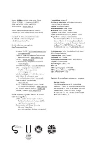 Periodicidade: semestral Revisão de submissões: arbitragem duplamente cega por Pares Académicos Direção: João Paulo Queiroz Relações públicas: Isabel Nunes Assessoria: Pedro Soares Neves Logística: Lurdes Santos, Conceição Reis Gestão financeira: Isabel Vieira, Andreia Tavares Propriedade e ser viços administrativos: Faculdade de Belas-Artes da Universidade de Lisboa / Centro de Investigação e de Estudos em Belas-Artes — Largo da Academia Nacional de Belas-Artes, 1249-058 Lisboa, Portugal T +351 213 252 108 / F +351 213 470 689 Crédito da capa: Sobre obra de Juan Rivas. Metal, 2014, fotografia digital. Projeto gráfico: Tomás Gouveia Paginação: Inês Chambel Impressão e acabamento: Greca Artes Gráficas Tiragem: 300 exemplares Depósito legal: 308352 / 10 PVP: 10€ ISSN (suporte papel): 1647-6158 ISSN (suporte eletrónico): 1647-7316 ISBN: 978-989-8771-18-6