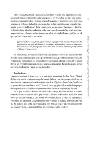 No obstante y a diferencia de Bayona, LaChapelle representa a un Jesucristo inserto en una idealización iconográfica tradicional, posiblemente relacionada con la efigie expuesta en las camisetas que inspiraron a la serie. En ambos casos deriva un probable mensaje que nos emplaza al germen del cristianismo como movimiento local de y para los inadaptados. Conclusiones La controversia de la ética en el arte suscitada a través de la obra Circus Christi de Bayona puede resolverse en palabras de Tolstoi cuando, pronunciándose en términos de cierto tratadista alemán de estética, Fólgeldt, observó que “era locura querer buscar moral en el arte” (Tolstoï, 2012: 43), pues dicho criterio segregador supondría la exclusión de obras esenciales de todos lo géneros y épocas. En lo que atañe a la dimensión formal del trabajo de dicho artista, el consecuente desenlace connotativo que evoca al ámbito publicitario equivale, para parte de la alta cultura, a una labor epidérmica, banal y vacía de contenido. Nosotros, no obstante, vislumbramos una vez más la alianza entre el arte y la moda, asunto que este autor resuelve con brillantez por el posicionamiento ideológico y la línea argumental en un cautivador fruto estético.
