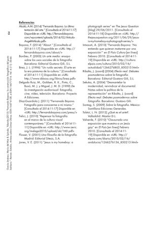 Referencias Alcalá, A.M. (2014) “Fernando Bayona. La última tentación del arte.” [Consultado el 2014-11-17] Disponible en <URL: http://fernandobayona. com/wp-content/uploads/2014/02/ArticuloAngelMAlcala.pdf> Bayona, F. (2014) “About.“ [Consultado el 2014-11-17] Disponible en <URL: http:// fernandobayona.com/about/> Bordieu, P. (2003) Un arte medio: ensayo sobre los usos sociales de la fotografia. Barcelona: Editorial Gustavo Gili, S.L. Brea, J. L. (1996) “Un ruido secreto. El arte en la era póstuma de la cultura.“ [Consultado el 2014-11-11] Disponible en <URL: http://www.ddooss.org/libros/brea.pdf> Delgado Ruiz, M., Goldsen, R. K., Pinto, C., Buxó, M. J. y Miguel, J. M. D. (1999) De la investigación audiovisual: fotografía, cine, vídeo, televisión. Barcelona: Proyecto A Ediciones. Díaz-Guardiola J. (2011) “Fernanado Bayona. Fotografío para conocerme a mí mismo.“ [Consultado el 2014-11-17] Disponible en <URL: http://fernandobayona.com/press/> Felici, J. (2010) “Repensar la fotografía en el marco de la cultura visual contemporánea.“ [Consultado el 2014-1111] Disponible en <URL: http://www.ae-ic. org/malaga2010/upload/ok/160.pdf> Flusser, V. (2001) Una filosofía de la fotografía. Madrid: Editorial Sítesis, S.A. Jones, V. E. (2011) “Jesus is my homeboy: a