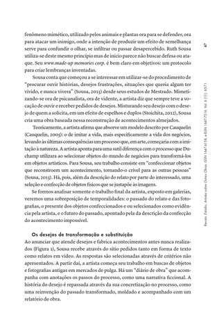 fenômeno mimético, utilizado pelos animais e plantas ora para se defender, ora para atacar um inimigo, onde a intenção de produzir um efeito de semelhança serve para confundir o olhar, se infiltrar ou passar desapercebido. Ruth Sousa utiliza-se deste mesmo princípio mas de início parece não buscar defesa ou ataque. Seu www.made-up memories corp. é bem claro em objetivos: um protocolo para criar lembranças inventadas. Sousa conta que começou a se interessar em utilizar-se do procedimento de “procurar ouvir histórias, desejos frustrações, situações que queria algum ter vivido, e nunca vivera” (Sousa, 2013) desde seus estudos de Mestrado. Mimetizando-se ora de psicanalista, ora de vidente, a artista diz que sempre teve a vocação de ouvir e receber pedidos de desejos. Misturando seu desejo com o desejo de quem a solicita, em um efeito de espelhos e duplos (Stoichita, 2012), Sousa cria uma obra baseada nessa reconstrução de acontecimentos almejados. Teoricamente, a artista afirma que absorve um modelo descrito por Cauquelin (Cauquelin, 2005): o de imitar a vida, mais especificamente a vida dos negócios, levando às últimas consequências um processo que, em arte, começaria com a imitação à natureza. A artista aponta para uma sutil diferença com o processo que Duchamp utilizara ao selecionar objetos do mundo de negócios para transformá-los em objetos artísticos. Para Sousa, seu trabalho consiste em “confeccionar objetos que reconstroem um acontecimento, tornando-o crível para as outras pessoas” (Sousa, 2013). Há, pois, além da descrição do relato por parte do interessado, uma seleção e confecção de objetos físicos que se justapõe às imagens. Se formos analisar somente o trabalho final da artista, exposto em galerias, veremos uma sobreposição de temporalidades: o passado do relato e das fotografias, o presente dos objetos confeccionados e ou selecionados como evidência pela artista, e o futuro do passado, apontado pela da descrição da confecção do acontecimento impossível.