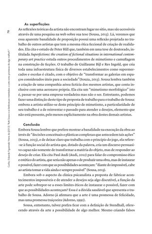 As superficções As reflexões teóricas da artista não encontram lugar no sitio, mas são acessíveis através de uma pesquisa na web sobre sua tese (Sousa, 2013). Lá, veremos que essa aparente banalidade de proposição possui uma reflexão projetada no trabalho de outros artistas que tem a mesma ótica ficcional de criação de realidades. Ela cita o estudo de Peter Hill que, também em uma tese de doutorado, intitulada Superfictions: the creation of fictional situations in international contemporary art practice estuda outros procedimentos de mimetismo e camuflagem na construção de ficções. O trabalho de Guillaume Bijl e Res Ingold, que cria toda uma infraestrutura física de diversos estabelecimentos como supermercados e escolas é citado, com o objetivo de “transformar as galerias em espaços considerados úteis para a sociedade”(Souza, 2013). Sousa lembra também a criação de uma companhia aérea fictícia dos mesmos artistas, que conta inclusive com uma aeronave própria. Ela cita um “mimetismo morfológico” isto é, passar-se por uma empresa verdadeira mas não o ser. Entretanto, podemos fazer uma distinção deste tipo de proposta de trabalho para o trabalho de Sousa: embora a artista utilize-se deste princípio de mimetismo, a particularidade de seu trabalho é a de reinventar o passado para atender a desejos, elemento que não está presente, pelo menos explicitamente na obra destes demais artistas. Conclusão Embora Sousa lembre que prefere mostrar a banalidade na execução da obra ao invés de “decisões conceituais e plásticas complexas que antecedem tais ações” (Sousa, 2013), e de deixar claro que trabalha com o princípio do jogo, ela refere-se à função social do artista que, dotado da palavra, cria um discurso persuasivo capaz não somente de transformar a matéria do objeto, mas de responder ao desejo de criar. Ela cita Paul Audi (Audi, 2012) para falar do compromisso ético e estético do artista, que seria não apenas o de produzir uma obra, mas de instaurar o possível, fazer com que as possibilidades aconteçam: “diante do impossível, cabe ao artista tornar a vida ainda e sempre possível” (Sousa, 2013). Embora sob o aspecto da clínica psicanalista a proposta de fabricar acontecimentos impossíveis e de atender a desejos seja algo discutível, a função da arte pode sobrepor-se a esses limites éticos de instaurar o possível, fazer com que as possibilidades aconteçam? Essa é a dúvida saudável que apresenta o trabalho de Sousa. Adorno já afirmara que a arte é uma promessa de felicidade, mas uma promessa traiçoeira (Adorno, 1992). Sousa, entretanto, talvez prefira ficar com a definição de Stendhall, oferecendo através da arte a possibilidade de algo melhor. Mesmo criando falsos