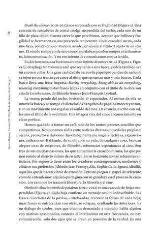 Break the silence (2010-2012) nos sorprende con su fragilidad (Figura 1). Una cascada de cascabeles de cristal cuelga suspendida del techo, cada uno de un hilo de plata tejido. Cuesta creer lo que percibimos, aceptar que belleza y fragilidad se hermanen en una presencia tan potente. Cada cascabel suena, cada uno tiene sonido propio. Rocío le añade con ironía al título: I objeto de un solo uso. El sonido rompe el silencio como las palabras pueden romper el aislamiento, la incomunicación. Y en ese intento de comunicarnos nos va la vida. En Are horizons, and horizons are at an infinite distance (2014) (Figura 2, Figura 3), despliega un volumen azul que recuerda a una barca, podría también ser un enorme collar. Una gran cantidad de barcos de papel que penden de nailon y se tejen en una trenza que crece al ritmo que se suman más y más barcos. Cada barco lleva una frase impresa: Having everything, Being able to do everything, Knowing everything. Estas frases leídas en conjunto con el título de la obra son cita de Lo inhumano, del filósofo francés Jean-François Lyotard. La trenza pende del techo, invitando al espectador. Al estirar de ella se mueve la barca y se rompe el silencio: los barquitos de papel se mecen y rozan, y en su movimiento nos regalan el sonido del mar. En el suelo, escrito con sal, leemos el título de la escultura. Una imagen viva del amor al conocimiento en clave poética. Hemos quedado a tomar un café, uno de los tantos placeres sencillos que compartimos. Nos ponemos al día entre noticias diversas, novedades propias y ajenas, proyectos e ilusiones. Inevitablemente me sugiere lecturas, exposiciones, reflexiones. Hablando, de su obra, de su vida, de cualquier cosa, brincan alegres citas de escritores, de filósofos, referencias espontáneas al cine. Son tres de sus muchas pasiones, las que alimentan la creación misma, las que ponen sonido al silencio íntimo de su taller. En su horizonte no hay referentes artísticos. Por supuesto tiene entre los creadores contemporáneos, modernos y clásicos sus preferidos (Alfredo Jaar, Francys Alis, Sophie Calle, Ignasi Alballi), aquellos que le hacen vibrar de emoción. Pero no juegan el papel de referente como lo entendemos: alguien que te guía con su grandeza en el proceso de creación. Los caminos los trazan la literatura, la filosofía y el cine. Otoño de silencios/otoño de palabras (2010-2012) es una cascada de hojas suspendidas (Figura 4). Cada hoja contiene un mensaje oculto, indescifrable. Las frases recortadas de la prensa, entrelazadas, recorren la forma de cada hoja; unas frases se entrecruzan con otras, se solapan, ocultando las anteriores. Es un diálogo de sordos, esos que vivimos demasiado a menudo: habla alguien con motivos apasionados, contesta el interlocutor en otra frecuencia, no hay comunicación, sólo dos egos que se creen en posesión de la verdad. Es una
