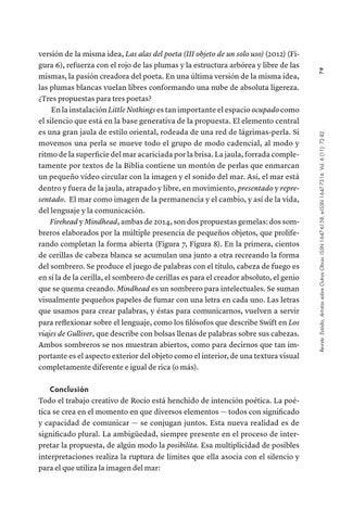 Conclusión Todo el trabajo creativo de Rocío está henchido de intención poética. La poética se crea en el momento en que diversos elementos — todos con significado y capacidad de comunicar — se conjugan juntos. Esta nueva realidad es de significado plural. La ambigüedad, siempre presente en el proceso de interpretar la propuesta, de algún modo la posibilita. Esa multiplicidad de posibles interpretaciones realiza la ruptura de límites que ella asocia con el silencio y para el que utiliza la imagen del mar: