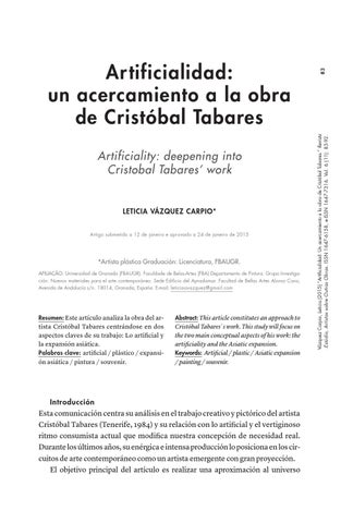 83 Vázquez Carpio, Leticia (2015) “Artificialidad: Un acercamiento a la obra de Cristóbal Tabares.” Revista :Estúdio, Artistas sobre Outras Obras. ISSN 1647-6158, e-ISSN 1647-7316. Vol. 6 (11): 83-92.