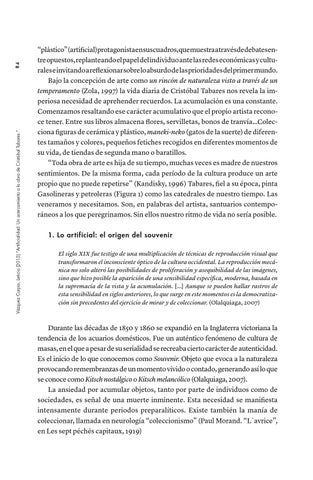“plástico”(artificial)protagonistaensuscuadros,quemuestraatravésdedebatesentre opuestos, replanteando el papel del individuo ante las redes económicas y culturales e invitando a reflexionar sobre lo absurdo de las prioridades del primer mundo. Bajo la concepción de arte como un rincón de naturaleza visto a través de un temperamento (Zola, 1997) la vida diaria de Cristóbal Tabares nos revela la imperiosa necesidad de aprehender recuerdos. La acumulación es una constante. Comenzamos resaltando ese carácter acumulativo que el propio artista reconoce tener. Entre sus libros almacena flores, servilletas, bonos de tranvía…Colecciona figuras de cerámica y plástico, maneki-neko (gatos de la suerte) de diferentes tamaños y colores, pequeños fetiches recogidos en diferentes momentos de su vida, de tiendas de segunda mano o baratillos. “Toda obra de arte es hija de su tiempo, muchas veces es madre de nuestros sentimientos. De la misma forma, cada período de la cultura produce un arte propio que no puede repetirse” (Kandisky, 1996) Tabares, fiel a su época, pinta Gasolineras y petroleras (Figura 1) como las catedrales de nuestro tiempo. Las veneramos y necesitamos. Son, en palabras del artista, santuarios contemporáneos a los que peregrinamos. Sin ellos nuestro ritmo de vida no sería posible. 1. Lo artificial: el origen del souvenir El siglo XIX fue testigo de una multiplicación de técnicas de reproducción visual que transformaron el inconsciente óptico de la cultura occidental. La reproducción mecánica no solo alteró las posibilidades de proliferación y asequibilidad de las imágenes, sino que hizo posible la aparición de una sensibilidad específica, moderna, basada en la supremacía de la vista y la acumulación. […] Aunque se pueden hallar rastros de esta sensibilidad en siglos anteriores, lo que surge en este momentos es la democratización sin precedentes del ejercicio de mirar y de coleccionar. (Olalquiaga, 2007)