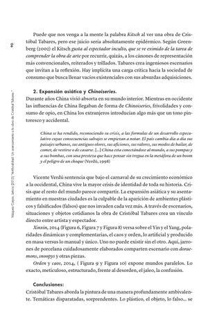 Vicente Verdú sentencia que bajo el carnaval de su crecimiento económico a la occidental, China vive la mayor crisis de identidad de toda su historia. Crisis que el resto del mundo parece compartir. La expansión asiática y su asentamiento en nuestras ciudades es la culpable de la aparición de ambientes plásticos y falsificados (falsos) que nos invaden cada vez más. A través de escenarios, situaciones y objetos cotidianos la obra de Cristóbal Tabares crea un vínculo directo entre artista y espectador. Xinxin, 2014 (Figura 6, Figura 7 y Figura 8) versa sobre el Yin y el Yang, polaridades dinámicas y complementarias, el caos y orden, lo artificial y producido en masa versus lo manual y único. Uno no puede existir sin el otro. Aquí, jarrones de porcelana cuidadosamente elaborados comparten escenario con doraemons, snoopys y otras piezas. Orden y caos, 2014, ( Figura 9 y Figura 10) expone mundos paralelos. Lo exacto, meticuloso, estructurado, frente al desorden, el jaleo, la confusión. Conclusiones: Cristóbal Tabares aborda la pintura de una manera profundamente ambivalente. Temáticas disparatadas, sorprendentes. Lo plástico, el objeto, lo falso… se