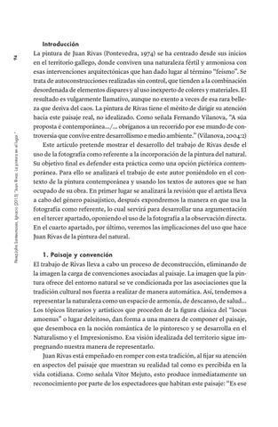 Introducción La pintura de Juan Rivas (Pontevedra, 1974) se ha centrado desde sus inicios en el territorio gallego, donde conviven una naturaleza fértil y armoniosa con esas intervenciones arquitectónicas que han dado lugar al término “feísmo”. Se trata de autoconstrucciones realizadas sin control, que tienden a la combinación desordenada de elementos dispares y al uso inexperto de colores y materiales. El resultado es vulgarmente llamativo, aunque no exento a veces de esa rara belleza que deriva del caos. La pintura de Rivas tiene el mérito de dirigir su atención hacia este paisaje real, no idealizado. Como señala Fernando Vilanova, “A súa proposta é contemporánea.../... obríganos a un recorrido por ese mundo de controversia que convive entre desarrollismo e medio ambiente.” (Vilanova, 2004:2) Este artículo pretende mostrar el desarrollo del trabajo de Rivas desde el uso de la fotografía como referente a la incorporación de la pintura del natural. Su objetivo final es defender esta práctica como una opción pictórica contemporánea. Para ello se analizará el trabajo de este autor poniéndolo en el contexto de la pintura contemporánea y usando los textos de autores que se han ocupado de su obra. En primer lugar se analizará la revisión que el artista lleva a cabo del género paisajístico, después expondremos la manera en que usa la fotografía como referente, lo cual servirá para desarrollar una argumentación en el tercer apartado, oponiendo el uso de la fotografía a la observación directa. En el cuarto apartado, por último, veremos las implicaciones del uso que hace Juan Rivas de la pintura del natural. 1. Paisaje y convención El trabajo de Rivas lleva a cabo un proceso de deconstrucción, eliminando de la imagen la carga de convenciones asociadas al paisaje. La imagen que la pintura ofrece del entorno natural se ve condicionada por las asociaciones que la tradición cultural nos fuerza a realizar de manera automática. Así, tendemos a representar la naturaleza como un espacio de armonía, de descanso, de salud... Los tópicos literarios y artísticos que proceden de la figura clásica del “locus amoenus” o lugar deleitoso, dan forma a una manera de componer el paisaje, que desemboca en la noción romántica de lo pintoresco y se desarrolla en el Naturalismo y el Impresionismo. Esa visión idealizada del territorio sigue impregnando nuestra manera de representarlo. Juan Rivas está empeñado en romper con esta tradición, al fijar su atención en aspectos del paisaje que muestran su realidad tal como es percibida en la vida cotidiana. Como señala Vítor Mejuto, esto produce inmediatamente un reconocimiento por parte de los espectadores que habitan este paisaje: “Es ese