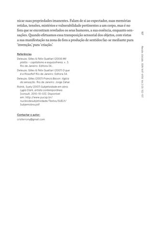 Deleuze, Gilles & Félix Guattari (2004) Mil platôs – capitalismo e esquizofrenia. v. 3. Rio de Janeiro: Editora 34,. Deleuze, Gilles & Félix Guattari (2007) O que é a filosofia? Rio de Janeiro: Editora 34. Deleuze, Gilles (2007) Francis Bacon: lógica da sensação. Rio de Janeiro: Jorge Zahar. Rolnik, Suely (2007) Subjetividade em obra. Lygia Clark, artista contemporânea. [consult. 2010-10-03]. Disponível em: http://www.pucsp.br/ nucleodesubjetividade/Textos/SUELY/ Subjemobra.pdf