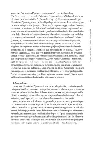 2002: 35). Fue Manet el “primer revolucionario” – según Greenberg (De Duve, 2005: 124), cuando “reinventa (¿o acaso inventa?) el cuadro-objeto, el cuadro como materialidad” (Foucault, 2005: 14). Hemos comprobado que Hernández Pijuan sigue esa estela, al igual que otros autores de su misma generación cronológica. Con Joaquim Chancho (Tarragona, 1943), también docente, encontramos un fuerte paralelismo. Chancho investiga desde la geometría y el ritmo, sin recurrir a una seriación fría, y enlaza con Hernández Pijuan en la síntesis de lo dibujado, así como en la densidad matérica: en ambos son cuidadas con esmero casi artesanal. La pastosidad también destaca en Gerard Richter (Dresde, 1932), con quien Hernández Pijuan comparte la faceta de grabador, aunque no nacionalidad. De Richter se subraya su método: el azar. El poder alegórico de su pintura “radica en la fuerza que [ésta] demuestra al ofrecer la experiencia de lo tangible, de lo físico que hay en el acto del pintor,…” (Lebrero Stals, 1994: 21). Al igual que con Hernández Pijuan, su pintura no proyecta ilusión formal o conceptual, es por el contrario una realidad en sí misma, de ahí que sea puramente objeto. Finalmente, Albert Ràfols-Casamada (Barcelona, 1923-2009) escritor y docente, comparte con Hernández Pijuan el modo de concebir la construcción del espacio pictórico cuando su pintura se vuelve un lenguaje en sí mismo autónomo. La aportación de Ràfols-Casamada en el panorama español, es subrayada por Hernández Pijuan al ser el color protagonista, “no los elementos extraños. […] Color y pintura plana de nuevo” (Yvars, 2006: 128). Ambos enfatizan el mismo fin: el tema es la pintura.