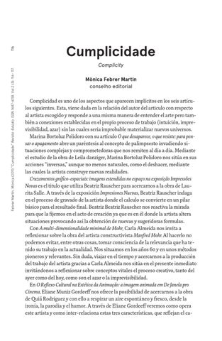 Complicidad es uno de los aspectos que aparecen implícitos en los seis artículos siguientes. Esta, viene dada en la relación del autor del articulo con respecto al artista escogido y responde a una misma manera de entender el arte pero también a conexiones establecidas en el propio proceso de trabajo (intuición, imprevisibilidad, azar) sin las cuales seria improbable materializar nuevos universos. Marina Bortoluz Polidoro con su artículo O que desaparece, o que resiste: para pensar o apagamento abre un paréntesis al concepto de palimpsesto invadiendo situaciones complejas y comprometedoras que nos remiten al día a día. Mediante el estudio de la obra de Leila danziger, Marina Bortoluz Polidoro nos sitúa en sus acciones “inversas,” aunque no menos naturales, como el deshacer, mediante las cuales la artista construye nuevas realidades. Cruzamentos gráfico-espaciais: imagens estendidas no espaço na exposição Impressões Novas es el titulo que utiliza Beatriz Rauscher para acercarnos a la obra de Laurita Salle. A través de la exposición Impresiones Nuevas, Beatriz Rauscher indaga en el proceso de gravado de la artista donde el calculo se convierte en un pilar básico para el resultado final. Beatriz Beatriz Rauscher nos reactiva la mirada para que la fijemos en el acto de creación ya que es en él donde la artista altera situaciones provocando así la obtención de nuevas y sugeridoras formulas. Con A multi-dimensionalidade minimal de Mohr, Carla Almeida nos invita a reflexionar sobre la obra del artista constructivista Manfred Mohr. Al hacerlo no podemos evitar, entre otras cosas, tomar consciencia de la relevancia que ha tenido su trabajo en la actualidad. Nos situamos en los años 60 y en unos métodos pioneros y relevantes. Sin duda, viajar en el tiempo y acercarnos a la producción del trabajo del artista gracias a Carla Almeida nos sitúa en el presente inmediato invitándonos a reflexionar sobre conceptos vitales el proceso creativo, tanto del ayer como del hoy, como son el azar o la imprevisibilidad. En O Reflexo Cultural na Estética da Animação: a imagem animada em De Janela pro Cinema, Eliane Muniz Gordeeff nos ofrece la posibilidad de acercarnos a la obra de Quiá Rodriguez y con ello a respirar un aire espontáneo y fresco, desde la ironía, la parodia y el humor. A través de Eliane Gordeeff veremos como opera este artista y como inter-relaciona estas tres características, que reflejan el ca-