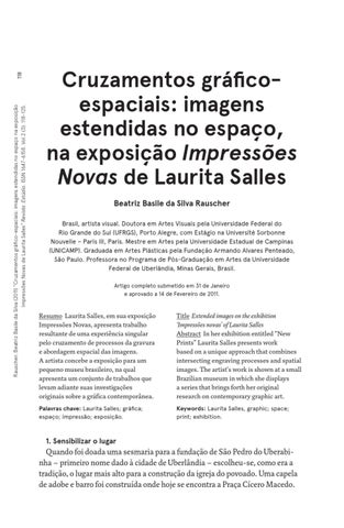 Cruzamentos gráficoespaciais: imagens estendidas no espaço, na exposição Impressões Novas de Laurita Salles Beatriz Basile da Silva Rauscher Brasil, artista visual. Doutora em Artes Visuais pela Universidade Federal do Rio Grande do Sul (UFRGS), Porto Alegre, com Estágio na Université Sorbonne Nouvelle – Paris III, Paris. Mestre em Artes pela Universidade Estadual de Campinas (UNICAMP). Graduada em Artes Plásticas pela Fundação Armando Alvares Penteado, São Paulo. Professora no Programa de Pós-Graduação em Artes da Universidade Federal de Uberlândia, Minas Gerais, Brasil. Artigo completo submetido em 31 de Janeiro e aprovado a 14 de Fevereiro de 2011.