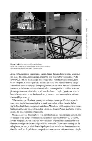 À sua volta, surgiram o cemitério, o rego d’agua da servidão pública e as primeiras casas do arraial. Nessa praça, encontra-se o Museu Universitário de Arte (MUnA), o edifício mais antigo desse lugar onde tudo foi transformado, renovado, apagado. Cercado por uma estreita calçada, está o limiar entre o antigo armazém e o ousado espaço de exposições em seu interior. Atravessado em um instante, pode levar o visitante desavisado a uma experiência inédita. Aos que já acompanham as atividades do MUnA, desde sua criação (1996), trata-se da busca de uma nova experiência estética, o penetrar em um mundo de idéias e formas (Figuras 1 a 4). Talvez essa experiência de passagem, mais que uma experiência temporal, uma experiência fenomenológica, tenha impactado a artista Laurita Salles (1952, São Paulo) em sua primeira visita ao MUnA em 2008. Alguns meses mais tarde, ela voltou ao museu trazendo a exposição Imagens Novas, que tem a própria galeria do museu como protagonista. O espaço, apesar de asséptico, com paredes brancas e iluminação natural, não corresponde ao que poderíamos considerar um típico cubo branco (O’Doherty, 2002), porque há ali um tanto de personalidade arquitetônica combinada com elementos originais de um antigo edifício comercial. Trata-se de um espaço de três planos, ou seja, o nível da rua ligado por duas escadas ao do mezanino e ao do chão. A altura do pé direito – superior a cinco metros – determinou a criação