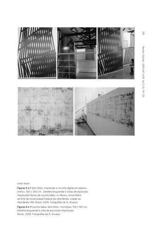 cima-baixo Figuras 5 a 7 Sem título, impressão e recorte digital em adesivo vinílico, 500 x 400 cm . Detalhe (esquerda) e vistas da exposição Impressões Novas de Laurita Salles, no Museu Universitário de Arte da Universidade Federal de Uberlândia, cidade de Uberlândia, MG, Brasil, 2008. Fotografias de G. Arcanjo. Figuras 8 e 9 Laurita Salles, Sem título, monotipia, 100 x 945 cm. Detalhe (esquerda) e vista da exposição Impressões Novas, 2008. Fotografias de G. Arcanjo.