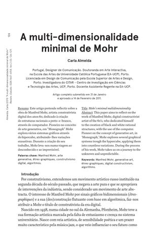 A multi-dimensionalidade minimal de Mohr Carla Almeida Portugal, Designer de Comunicação. Doutoranda em Arte Interactiva, na Escola das Artes da Universidade Católica Portuguesa (EA-UCP), Porto. Licenciada em Design de Comunicação pela Escola Superior de Artes e Design, Porto. Investigadora do CITAR - Centro de Investigação em Ciências e Tecnologia das Artes, UCP, Porto. Docente Assistente Regente na EA-UCP. Artigo completo submetido em 31 de Janeiro e aprovado a 14 de Fevereiro de 2011.