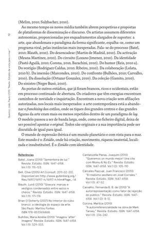 (Melim, 2010; Sulzbacher, 2010). Ao mesmo tempo os novos média também abrem perspetivas e propostas de plataformas de disseminação e discurso. Os artistas assumem diferentes autonomias, proporcionadas por enquadramentos alargados de suportes: a arte, que abandonara o paradigma da forma significante, espalha-se, como um programa viral, pelas instâncias mais inesperadas. Fala-se do processo (Batel, 2010; Blauth, 2010). Do desencadear (Martin de Madrid, 2010). Da activação (Meana Martinez, 2010). Do circuito (Lozano Jimenez, 2010). Da identidade (Pastó Aguilà, 2010; Corona, 2010, Barachini, 2010). Do humor (Reis, 2010 a). Do vestígio (Rodriguez Caldas, 2010; Ribeiro, 2010). Da colaboração (Lolata, 2010 b). Da imersão (Marcondes, 2010). Do confronto (Bulhões, 2010; Carvalho, 2010). Da dissolução (Ortuzar Gonzalez, 2010). Da coleção (Gamito, 2010). Do sinistro (Negre Busó, 2010). As portas de outros estúdios, que já foram brancos, ricos e ocidentais, estão em processo continuado de abertura. Os criadores que têm energias encontram caminhos de novidade e inquietação. Encontram a nova criação sem afiliações autorizadas, nos locais mais inesperados: a arte contemporânea está a abandonar o franchising dos estilos, onde os tiques dos grandes centros e das grandes figuras da arte eram mais ou menos repetidos dentro de um paradigma de lag. O modelo passou a ser de banda larga, onde, como no ficheiro digital, deixa de ser possível apontar o original. Todos são originais e a sua importância pode ser discutida de igual para igual. O mundo de expressão ibérica é um mundo planetário e com vista para o mar. Este mundo é o :Estúdio, onde há criação, movimento, riqueza imaterial, localizada e insubstituível. É o :Estúdio com identidade. Referências Batel, Joana (2010) “Sementeira de luz.” Revista :Estúdio. ISSN: 1647-6158. Vol.1 (1): 115-123. Bell, Clive (2005) Art [consult. 2011-02-20]. Disponível em http://www.gutenberg.org/ files/16917/16917-h/16917-h.htm#Page_-14 Blauth, Lurdi (2010) “Gravura: marcas e vestígios condensados entre vazios e cheios.” Revista :Estúdio. ISSN: 1647-6158. Vol.1 (1): 171-176. Brian O'Doherty (2007) No interior do cubo branco: a ideologia do espaço da arte. São Paulo: Martins Fontes. ISBN 978-8533616868. Bulhões, Maria Amélia (2010) “Imagens ‘after’ imagens” Revista :Estúdio. ISSN: 1647-6158. Vol.1 (1): 329-333.