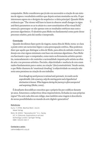 Quando decidimos fazer parte da viagem, numa obra de Mohr, torna-se clara a ponte entre um raciocínio lógico e uma preocupação estética. Mas podemos dizer que aquilo que distingue a obra de Mohr, para além do método criativo é o desejo em criar signos minimais com base em sistemas algoritmos. Para Mohr era fascinante o que o computador, como meio ou ferramenta artística permitia, nomeadamente o de controlar a racionalidade imposta pelo artista na obra de arte e no processo artístico. Precisão, objectividade e ausência de erro eram razões fundamentais para o autor, na criação ‘(des)construtivista’. Sendo assim, o que Mohr chamava de ‘emotional clouding’ à subjectividade ou emoção não seria uma premissa na criação do seu trabalho. Even though my work process is rational and systematic, its results can be unpredictable. Like a journey, only the starting point and a hypothetical destination is known. What happens during the journey is often unexpected and surprising (Mohr, 2002). É desafiante descodificar conceitos que o próprio fez por codificar durante 30 anos. Estaremos a subjectivar obras impenetráveis, fechadas às suas próprias regras? Ou será cada obra um código, mas também uma viagem à descoberta de novas possibilidades no mundo da arte digital e generativa? Referências Kurtz, T. (1994). Manfred Mohr. Zürich: Waser Verlag. Mohr, M. (2002). “Generative Art.” In L. Candy, & E. A. Edmonds, Explorations in art and technology London: Springer-Verlag. ISBN 1-85233-545-9