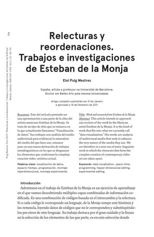 Relecturas y reordenaciones. Trabajos e investigaciones de Esteban de la Monja Eloi Puig Mestres España, artista e professor na Universitat de Barcelona. Doctor em Belles Arts pela mesma Universidade. Artigo completo submetido em 31 de Janeiro e aprovado a 14 de Fevereiro de 2011.
