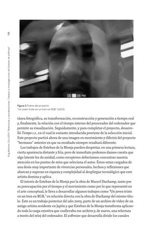 tánea fotográfica, su transformación, reconstrucción y generación a tiempo real y, finalmente, la relación con el tiempo interno del procesador del ordenador que permite su visualización. Seguidamente, y para completar el proyecto, desarrolló Tiempo 1.2., en el cual la variante introducida proviene de la selección inicial. Este proyecto partirá ahora de una imagen en movimiento y diferirá del proyecto “hermano" anterior en que su resultado siempre resultará diferente. Los trabajos de Esteban de la Monja pueden despertar, en una primera lectura, cierta apariencia distante y fría, pero de inmediato podemos damos cuenta que algo latente les da unidad, como receptores deberíamos concentrar nuestra atención en los puntos de mira que seleciona el autor. Éstos estan cargados de una dosis muy importante de vivencias personales, hechos y reflexiones que abarcan y superan en riqueza y complejidad al despliegue tecnológico que este artista domina y aplica. El interés de Esteban de la Monja por la obra de Marcel Duchamp, tanto por su preocupación por el tiempo y el movimiento como por lo que representó en el arte conceptual, le lleva a desarrollar algunos trabajos como “Un joven triste en un tren en RGB,” en relación directa con la obra de Duchamp del mismo título. Este es un trabajo posterior del año 2003, parte de un archivo de video de un amigo artista residente en Japón y que Esteban de la Monja transforma aplicando toda la carga emotiva que conllevaba ese archivo y, de nuevo, una relectura a través del reloj del ordenador. El software que desarrolla divide los canales