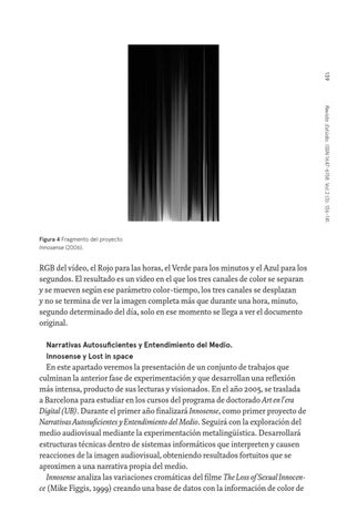 En este apartado veremos la presentación de un conjunto de trabajos que culminan la anterior fase de experimentación y que desarrollan una reflexión más intensa, producto de sus lecturas y visionados. En el año 2005, se traslada a Barcelona para estudiar en los cursos del programa de doctorado Art en l’era Digital (UB). Durante el primer año finalizará Innosense, como primer proyecto de Narrativas Autosuficientes y Entendimiento del Medio. Seguirá con la exploración del medio audiovisual mediante la experimentación metalingüística. Desarrollará estructuras técnicas dentro de sistemas informáticos que interpreten y causen reacciones de la imagen audiovisual, obteniendo resultados fortuitos que se aproximen a una narrativa propia del medio. Innosense analiza las variaciones cromáticas del filme The Loss of Sexual Innocence (Mike Figgis, 1999) creando una base de datos con la información de color de