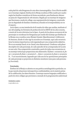 cada píxel de cada fotograma de esta obra cinematográfica. Con el fin de modificar el montaje original, Esteban de la Monja reordena el film cuadro por cuadro según las familias cromáticas de forma ascendente, para finalmente obtener un pieza de-fragmentada de 106 minutos. Regida por un montaje de imágenes que funcionan a modo de collage, una superposición de imágenes construida por un degradado de familias cromáticas y basada en la temporalidad y no en el espacio. Lost in Space, es una instalación de 8 canales de video que analiza, mediante el uso del sampling, los formatos de producción de los EEUU de los años sesenta, a través de la serie televisiva Lost in Space. A partir de los planos secuencia de los personajes se reordenan los fotogramas por medio del montaje que Esteban de la Monja crea y nombra como Montaje Granular-Hiperdimensional. A diferencia de Innosense, donde el color rige la sucesión en el montaje, aquí cada secuencia tiene la misma importancia y está organizada por una composición subjetiva. No es un montaje lineal, ni no-lineal, sino dimensional. Condensa cada plano descriptivo de cada personaje, de cada episodio de las 3 temporadas de la serie en uno solo. Una composición construida a partir de todas esas secuencias en un montaje vertical que proporciona otra dimensión. El frame 1-secuencia A, frame 1-secuencia B, frame 1-secuencia C… frame 2-secuencia A, frame 2-secuencia B… Y así sucesivamente, logrando que cada una de las aportaciones principales de cada personaje se proyecten en distintos monitores (uno para cada personaje, 8 en total).