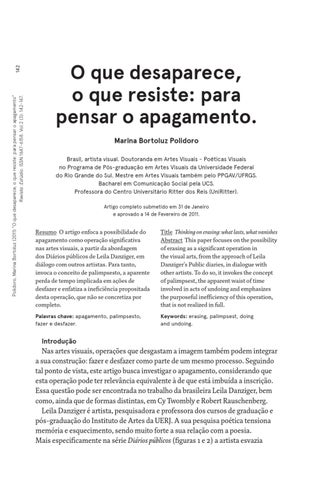 O que desaparece, o que resiste: para pensar o apagamento. Marina Bortoluz Polidoro Brasil, artista visual. Doutoranda em Artes Visuais - Poéticas Visuais no Programa de Pós-graduação em Artes Visuais da Universidade Federal do Rio Grande do Sul. Mestre em Artes Visuais também pelo PPGAV/UFRGS. Bacharel em Comunicação Social pela UCS. Professora do Centro Universitário Ritter dos Reis (UniRitter). Artigo completo submetido em 31 de Janeiro e aprovado a 14 de Fevereiro de 2011.