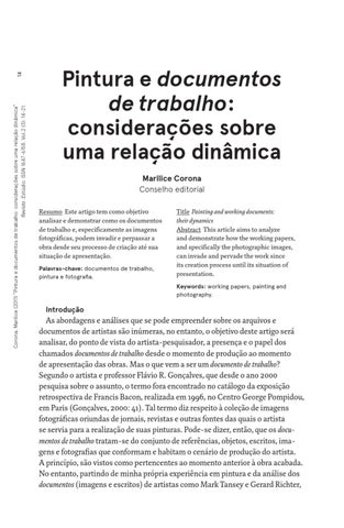 Pintura e documentos de trabalho: considerações sobre uma relação dinâmica Marilice Corona Conselho editorial Resumo Este artigo tem como objetivo analisar e demonstrar como os documentos de trabalho e, especificamente as imagens fotográficas, podem invadir e perpassar a obra desde seu processo de criação até sua situação de apresentação. Palavras-chave: documentos de trabalho, pintura e fotografia.