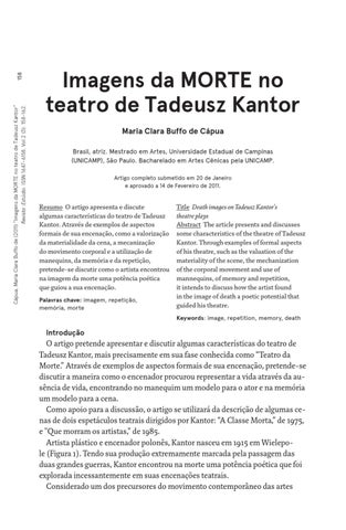 Imagens da MORTE no teatro de Tadeusz Kantor Maria Clara Buffo de Cápua Brasil, atriz. Mestrado em Artes, Universidade Estadual de Campinas (UNICAMP), São Paulo. Bacharelado em Artes Cênicas pela UNICAMP. Artigo completo submetido em 20 de Janeiro e aprovado a 14 de Fevereiro de 2011.