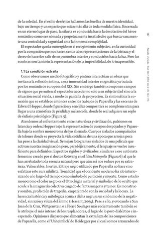 Como observamos medio fotográfico y pintura interactúan en obras que invitan a la reflexión íntima, a esa inmensidad interior enigmática ya tratada por los románticos europeos del XIX. Sin embargo también componen campos de signos que permiten al espectador acceder no solo a su subjetividad sino a la situación social vivida, a modo de pantalla de proyección. Es sintomática la conexión que se establece entonces entre los trabajos de Paparella y las escenas de Edward Hopper, donde figuración y sencillez compositiva se complementan para llegar a una atmósfera de pérdida y melancolía, donde lo real adquiere un soplo de énfasis psicológico (Figura 5). Atendemos al enfrentamiento entre naturaleza y civilización, pulsiones en latencia y orden; Hopper bajo la representación de cuerpos despojados y Paparella bajo la sombra monocroma del yo alienado. Cuerpos aislados acompañados de telones donde se proyecta la vida cotidiana de una época que arrojan poca luz pese a la claridad visual. Semejan fotogramas aislados de una película que activan nuestra imaginación pero, paradójicamente, el lenguaje se vuelve insuficiente para definirlos. Espectros rígidos y civilizados, similares a ese autómata femenino creado por el doctor Rotwang en el film Metropolis (Figura 6) al que le han arrebatado toda esencia natural pero que aún así nos seduce por su extrañeza. Vulnerables. Inertes. El traje negro utilizado por Paparella no hace sino enfatizar este aura nihilista. Tonalidad que el occidente moderno ha ido interiorizando a lo largo del tiempo como símbolo de perdición y muerte. Como estadio monocromo el color negro es el Otro, lugar material y simbólico de lo oculto que acude a la imaginería colectiva cargado de fantasmagoria y temor. Es monstruo y sombra, predicción de tragedia, emparentado con la suciedad y la locura. La herencia histórica y mitológica acuña a dicha negrura un sinónimo de la negatividad, sinrazón y vileza del ánimo (Hersant, 2004). Pese a ello, y evocando a San Juan de la Cruz, Wittgenstein o a Pierre Soulages más recientemente también se le atribuye el más intenso de los resplandores, el lugar de lo post-dialéctico e inesperado. Opiniones dispares que alimentan la extrañeza de las composiciones de Paparella, como el ‘Unheimlich’ de Heidegger por el cual somos arrancados de
