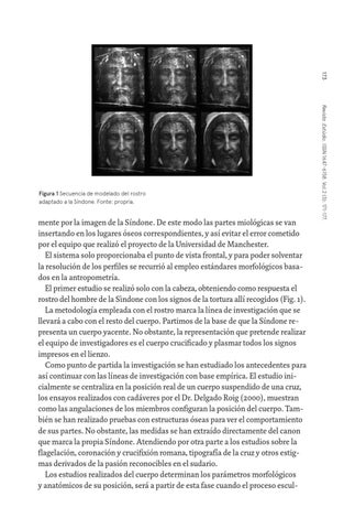 mente por la imagen de la Síndone. De este modo las partes miológicas se van insertando en los lugares óseos correspondientes, y así evitar el error cometido por el equipo que realizó el proyecto de la Universidad de Manchester. El sistema solo proporcionaba el punto de vista frontal, y para poder solventar la resolución de los perfiles se recurrió al empleo estándares morfológicos basados en la antropometría. El primer estudio se realizó solo con la cabeza, obteniendo como respuesta el rostro del hombre de la Sìndone con los signos de la tortura allí recogidos (Fig. 1). La metodología empleada con el rostro marca la línea de investigación que se llevará a cabo con el resto del cuerpo. Partimos de la base de que la Síndone representa un cuerpo yacente. No obstante, la representación que pretende realizar el equipo de investigadores es el cuerpo crucificado y plasmar todos los signos impresos en el lienzo. Como punto de partida la investigación se han estudiado los antecedentes para así continuar con las líneas de investigación con base empírica. El estudio inicialmente se centraliza en la posición real de un cuerpo suspendido de una cruz, los ensayos realizados con cadáveres por el Dr. Delgado Roig (2000), muestran como las angulaciones de los miembros configuran la posición del cuerpo. También se han realizado pruebas con estructuras óseas para ver el comportamiento de sus partes. No obstante, las medidas se han extraído directamente del canon que marca la propia Síndone. Atendiendo por otra parte a los estudios sobre la flagelación, coronación y crucifixión romana, tipografía de la cruz y otros estigmas derivados de la pasión reconocibles en el sudario. Los estudios realizados del cuerpo determinan los parámetros morfológicos y anatómicos de su posición, será a partir de esta fase cuando el proceso escul-